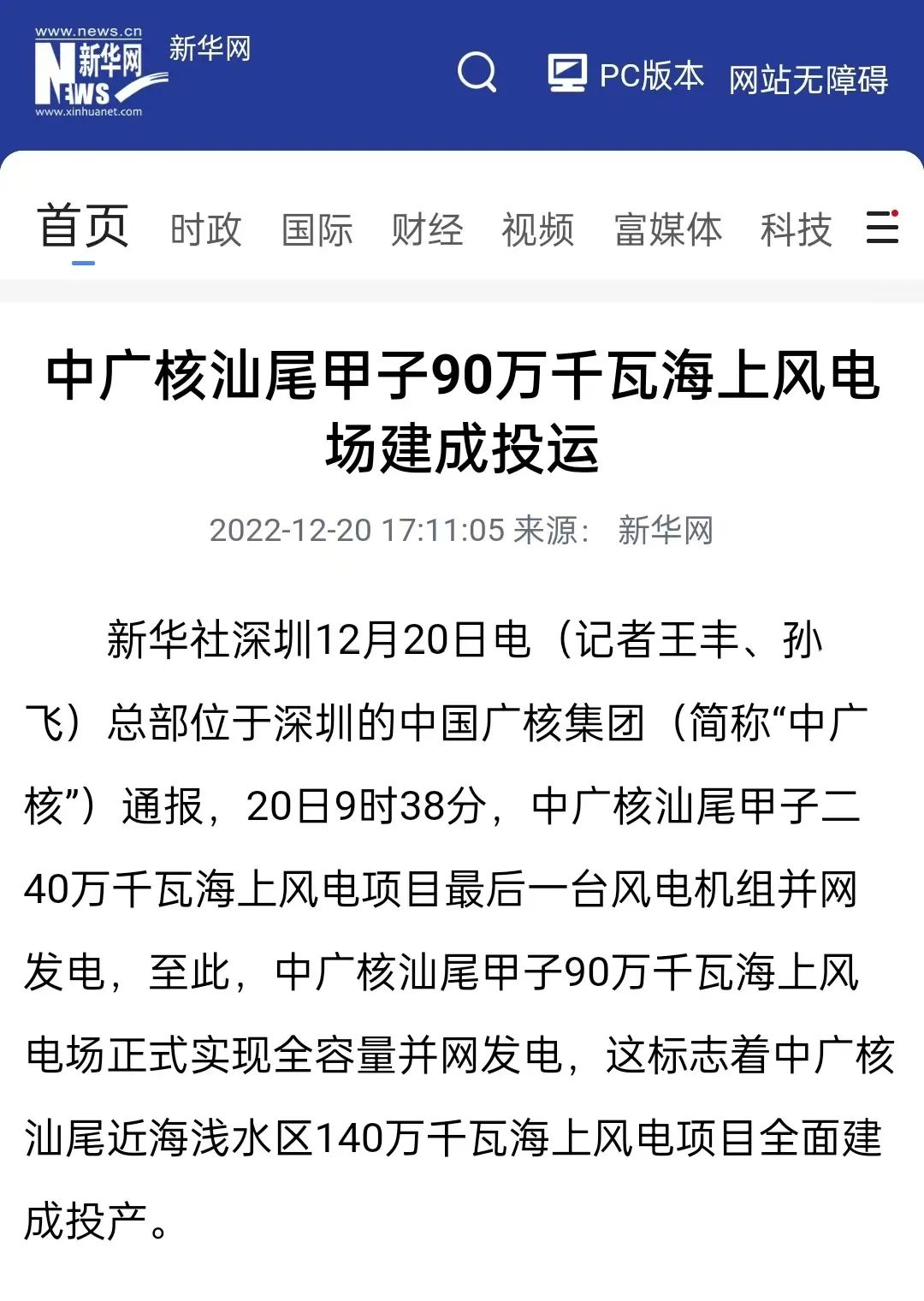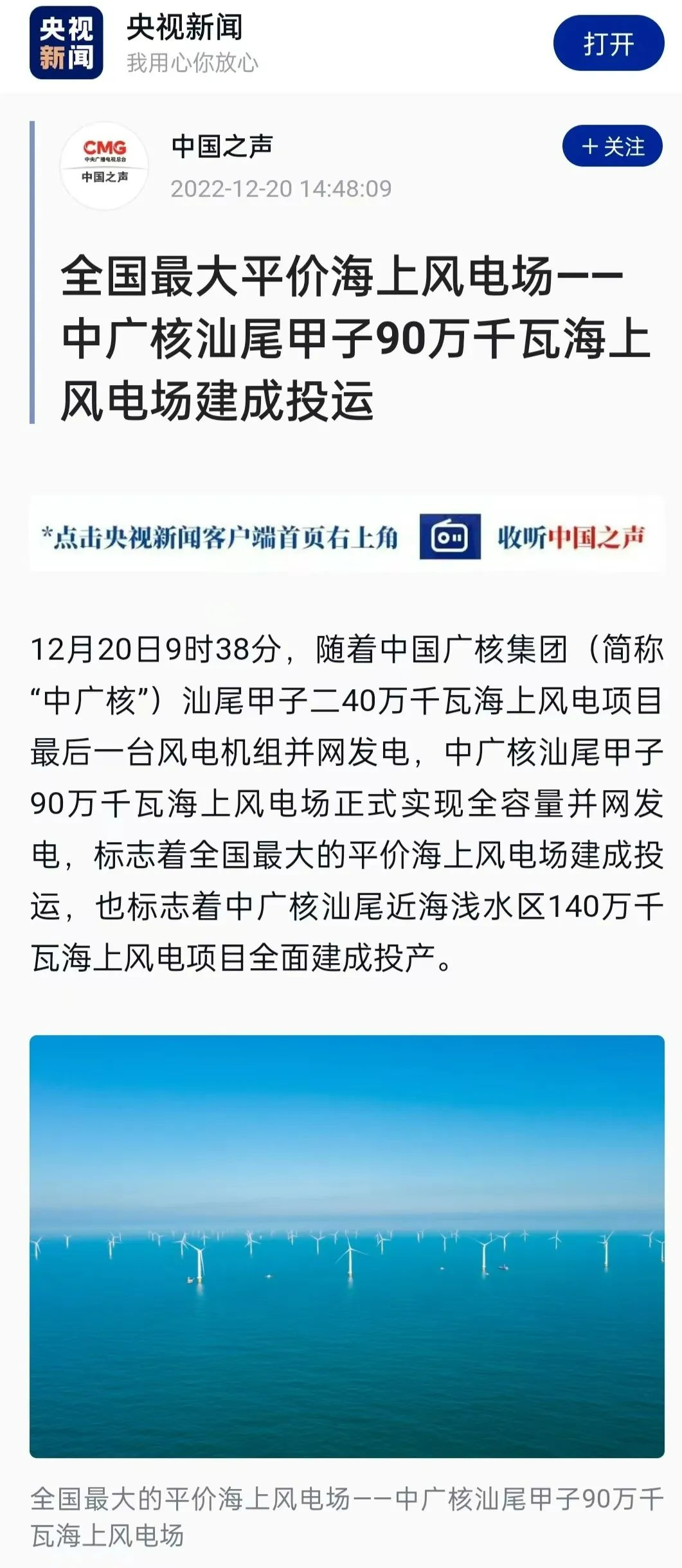 12月20日9時(shí)38分,隨著中國(guó)廣核集團(tuán)(簡(jiǎn)稱(chēng)“中廣核”)汕尾甲子二40萬(wàn)千瓦海上風(fēng)電項(xiàng)目最后一臺(tái)風(fēng)電機(jī)組并網(wǎng)發(fā)電,中廣核汕尾甲子90萬(wàn)千瓦海上風(fēng)電場(chǎng)正式實(shí)現(xiàn)全容量并網(wǎng)發(fā)電,標(biāo)志著全國(guó)最大的平價(jià)海上風(fēng)電場(chǎng)建成投運(yùn),也標(biāo)志著中廣核汕尾近海淺水區(qū)140萬(wàn)千瓦海上風(fēng)電項(xiàng)目全面建成投產(chǎn)。