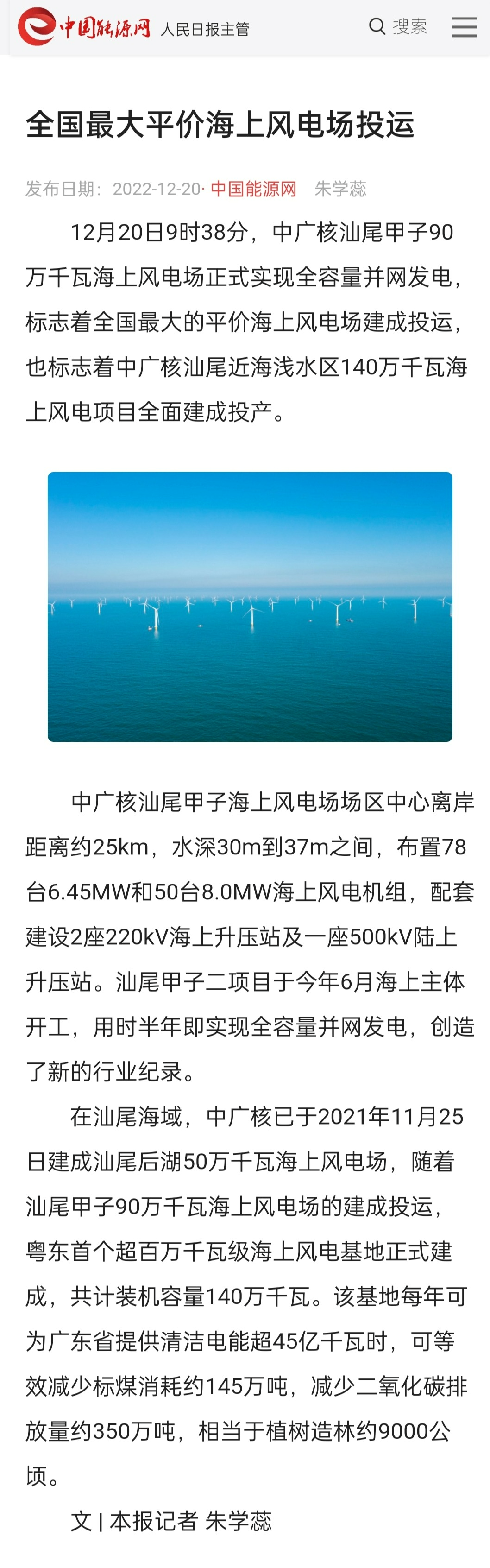在汕尾海域,中廣核已于2021年11月25日建成汕尾后湖50萬(wàn)千瓦海上風(fēng)電場(chǎng),隨著汕尾甲子90萬(wàn)千瓦海上風(fēng)電場(chǎng)的建成投運(yùn),粵東首個(gè)超百萬(wàn)千瓦級(jí)海上風(fēng)電基地正式建成,共計(jì)裝機(jī)容量140萬(wàn)千瓦。該基地每年可為廣東省提供清潔電能超45億千瓦時(shí),可等效減少標(biāo)煤消耗約145萬(wàn)噸,減少二氧化碳排放量約350萬(wàn)噸,相當(dāng)于植樹(shù)造林約9000公頃。