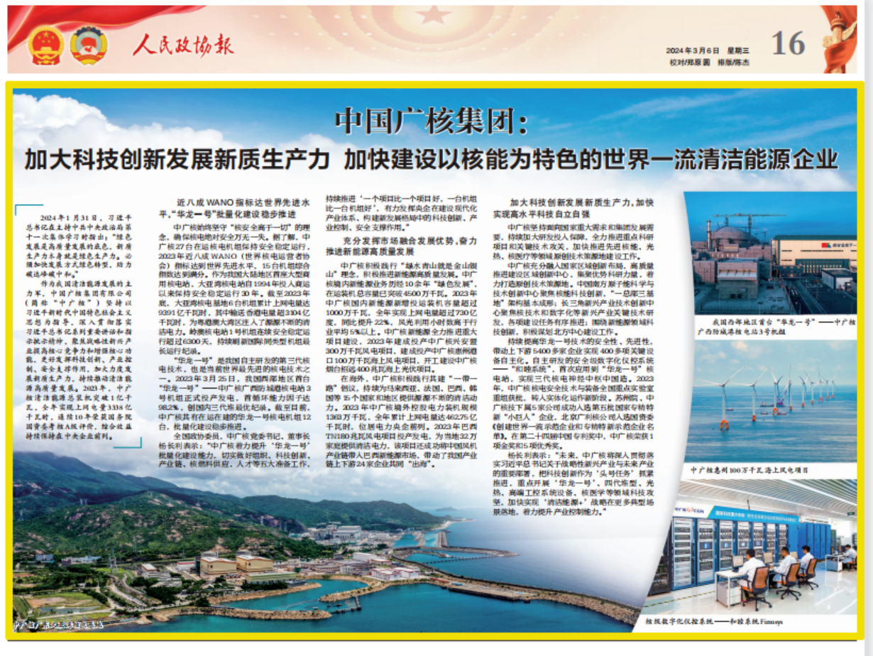 《中國廣核集團:加大科技創(chuàng)新發(fā)展新質(zhì)生產(chǎn)力加快建設以核能為特色的世界一流清潔能源企業(yè)》