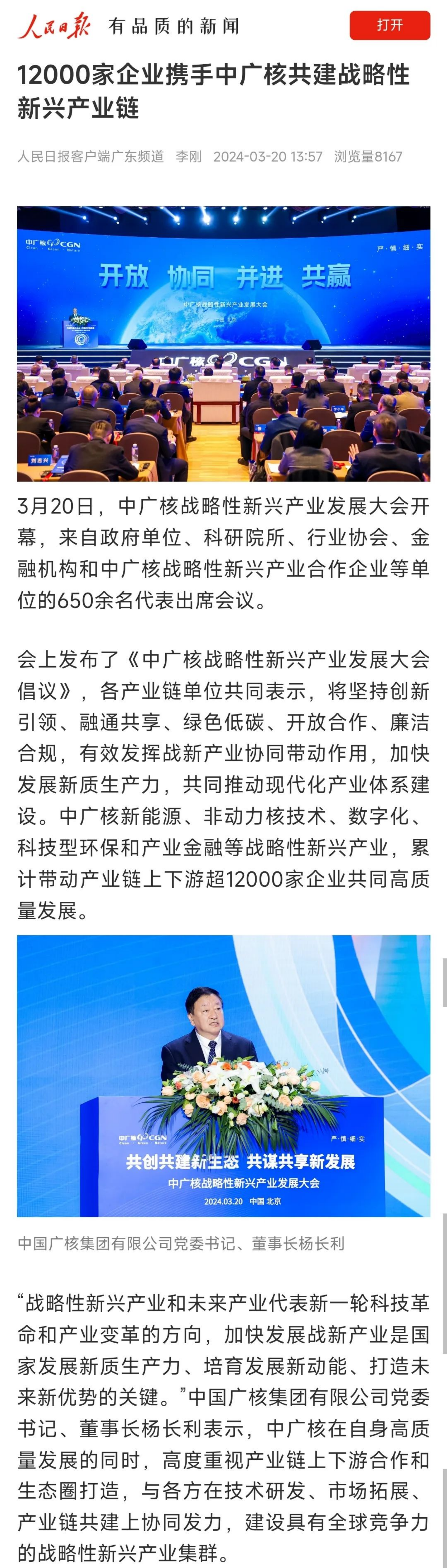中廣核新能源、非動力核技術、數(shù)字化、科技型環(huán)保和產(chǎn)業(yè)金融等戰(zhàn)略性新興產(chǎn)業(yè),已累計帶動產(chǎn)業(yè)鏈上下游超12000家企業(yè)共同高質量發(fā)展。人民日報、新華社等主流媒體聚焦報道。