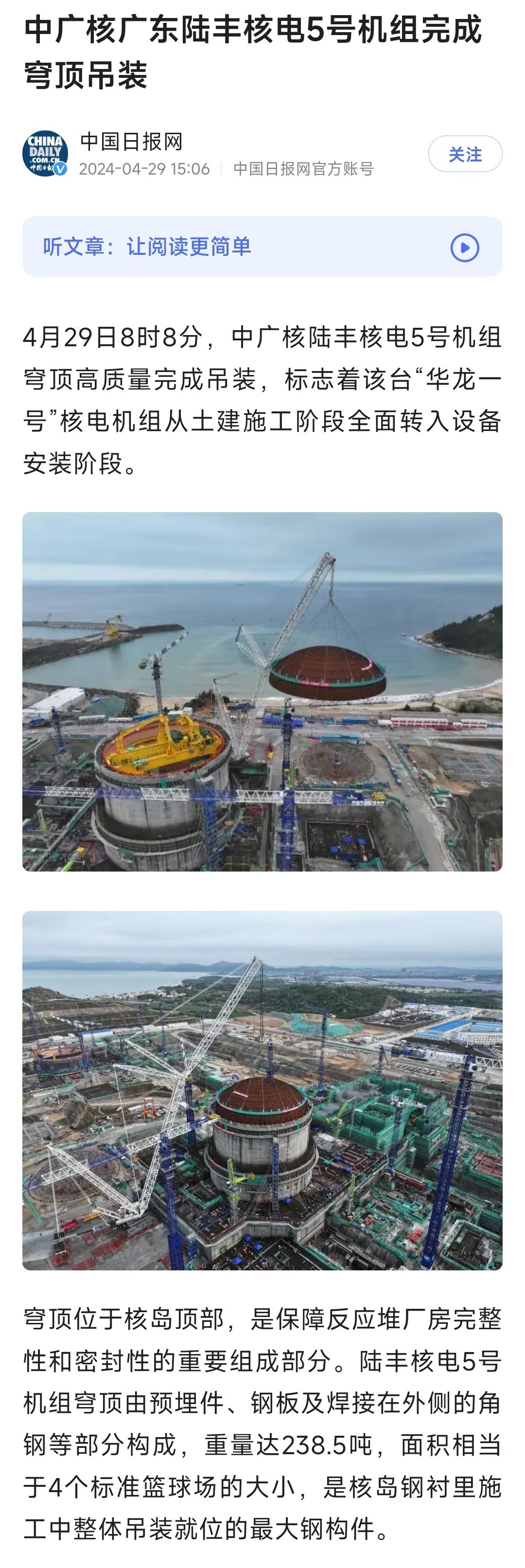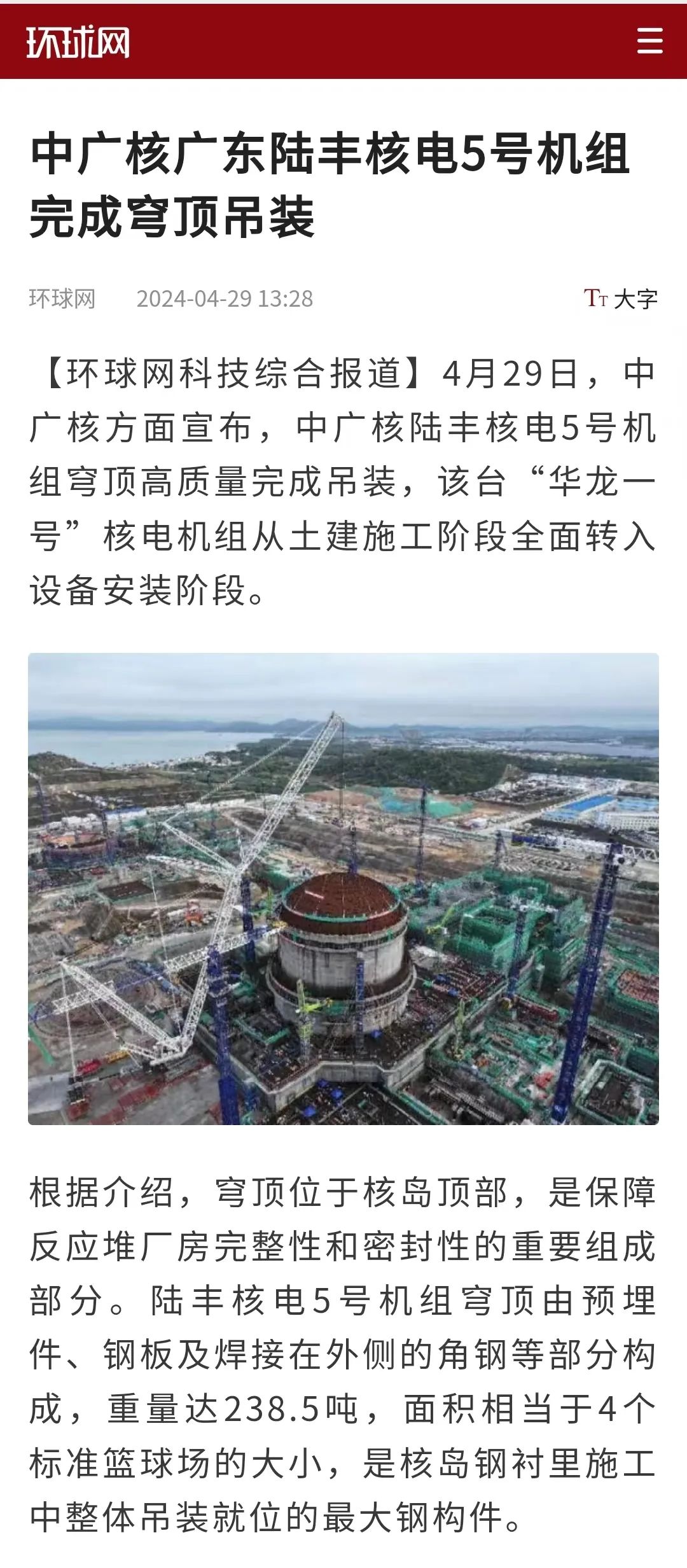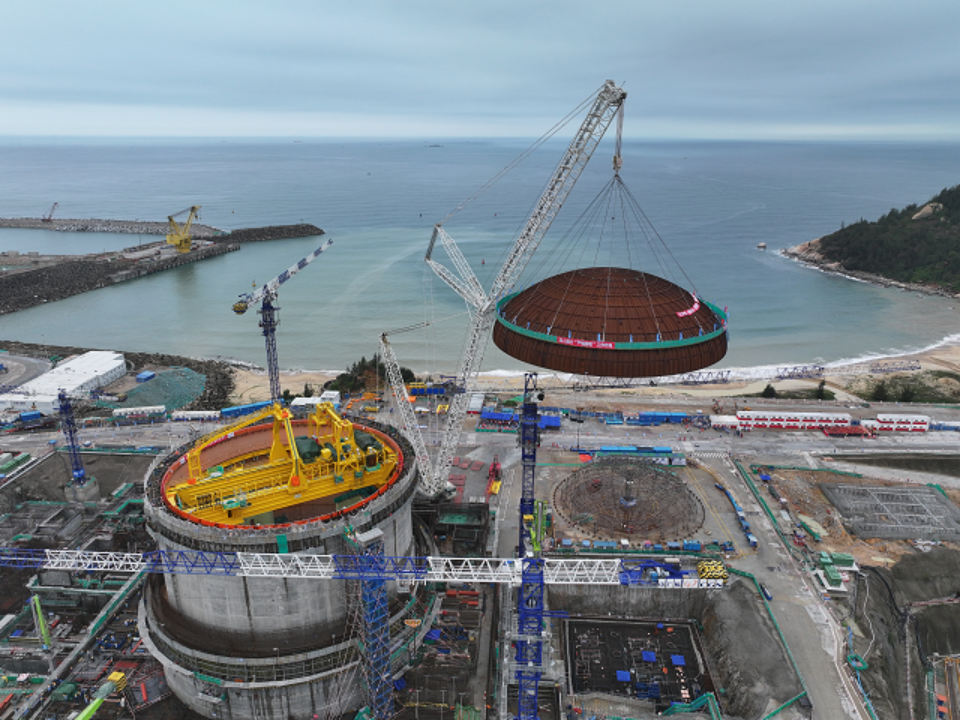 4月29日8時(shí)8分,中廣核廣東陸豐核電項(xiàng)目5號(hào)機(jī)組穹頂完成吊裝,標(biāo)志著該臺(tái)“華龍一號(hào)”核電機(jī)組從土建施工階段全面轉(zhuǎn)入設(shè)備安裝階段。人民日?qǐng)?bào)、新華社、央視等多家主流媒體對(duì)此進(jìn)行聚焦報(bào)道。