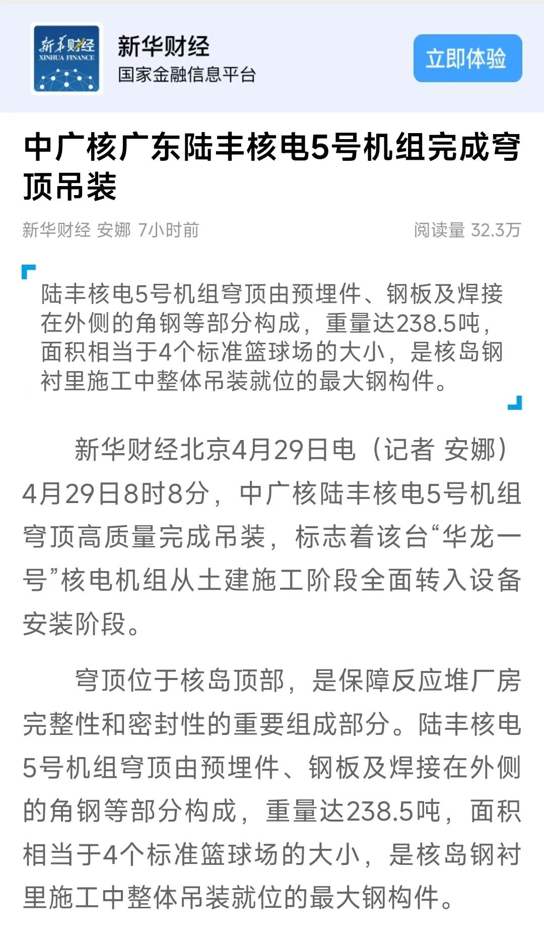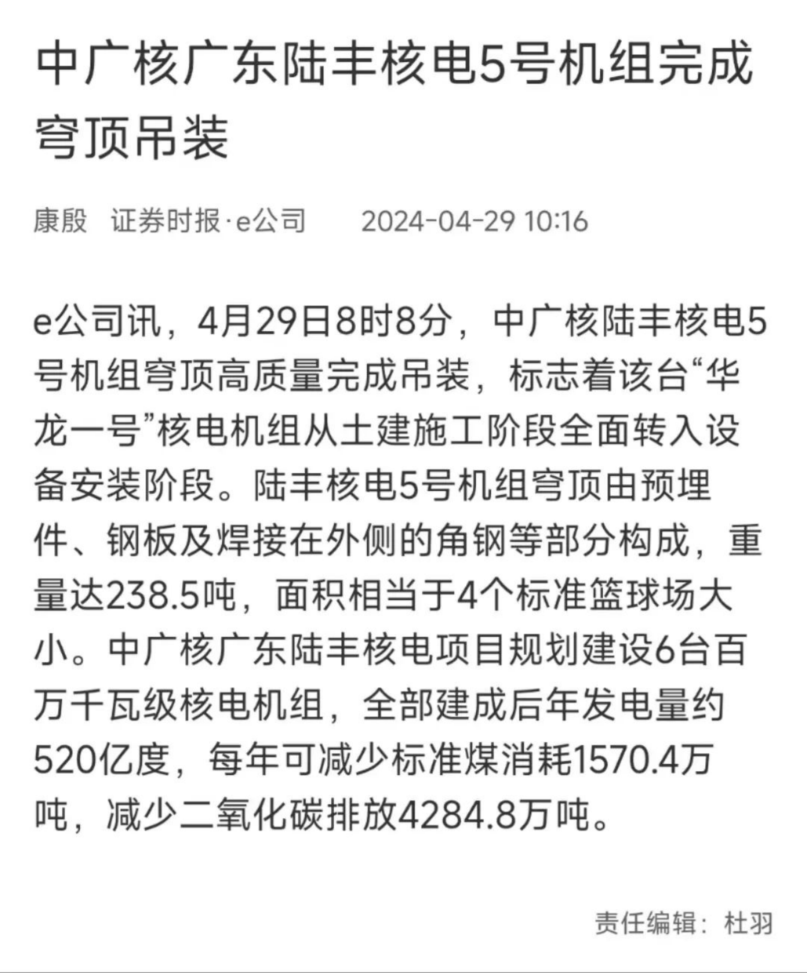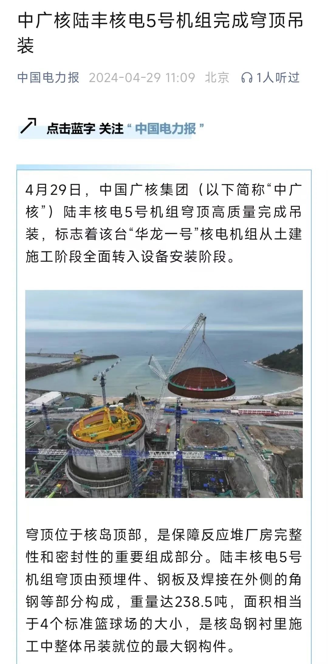 4月29日8時(shí)8分,中廣核廣東陸豐核電項(xiàng)目5號(hào)機(jī)組穹頂完成吊裝,標(biāo)志著該臺(tái)“華龍一號(hào)”核電機(jī)組從土建施工階段全面轉(zhuǎn)入設(shè)備安裝階段。人民日?qǐng)?bào)、新華社、央視等多家主流媒體對(duì)此進(jìn)行聚焦報(bào)道。