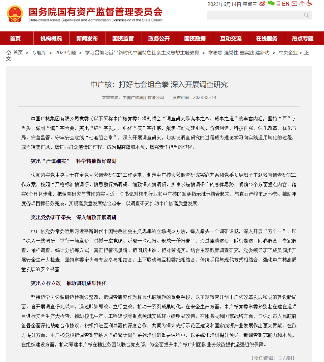 6月14日,國務(wù)院國資委官網(wǎng)刊發(fā)《中廣核:打好七套組合拳 深入開展調(diào)查研究》,從多個角度報道中國廣核集團有限公司黨委堅持“嚴慎細實”工作作風,聚焦打好“七套組合拳”,深入開展調(diào)查研究,高質(zhì)量推動主題教育走深走實。